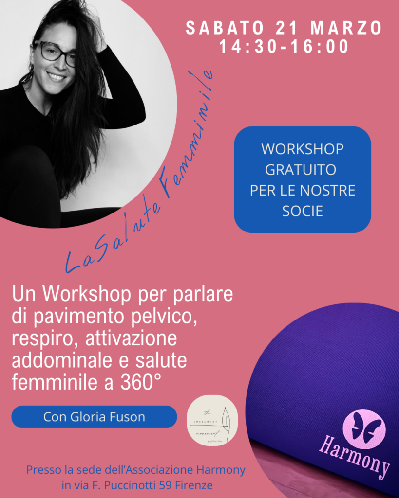 Sabato 21 marzo dalle 14:30 alle 16:00 abbiamo organizzato un workshop sulla salute femminile con un’istruttrice esterna, Gloria Fuson, che si occupa da anni di tale tematica declinata sia nel Pilates che nell’attività motoria in generale.